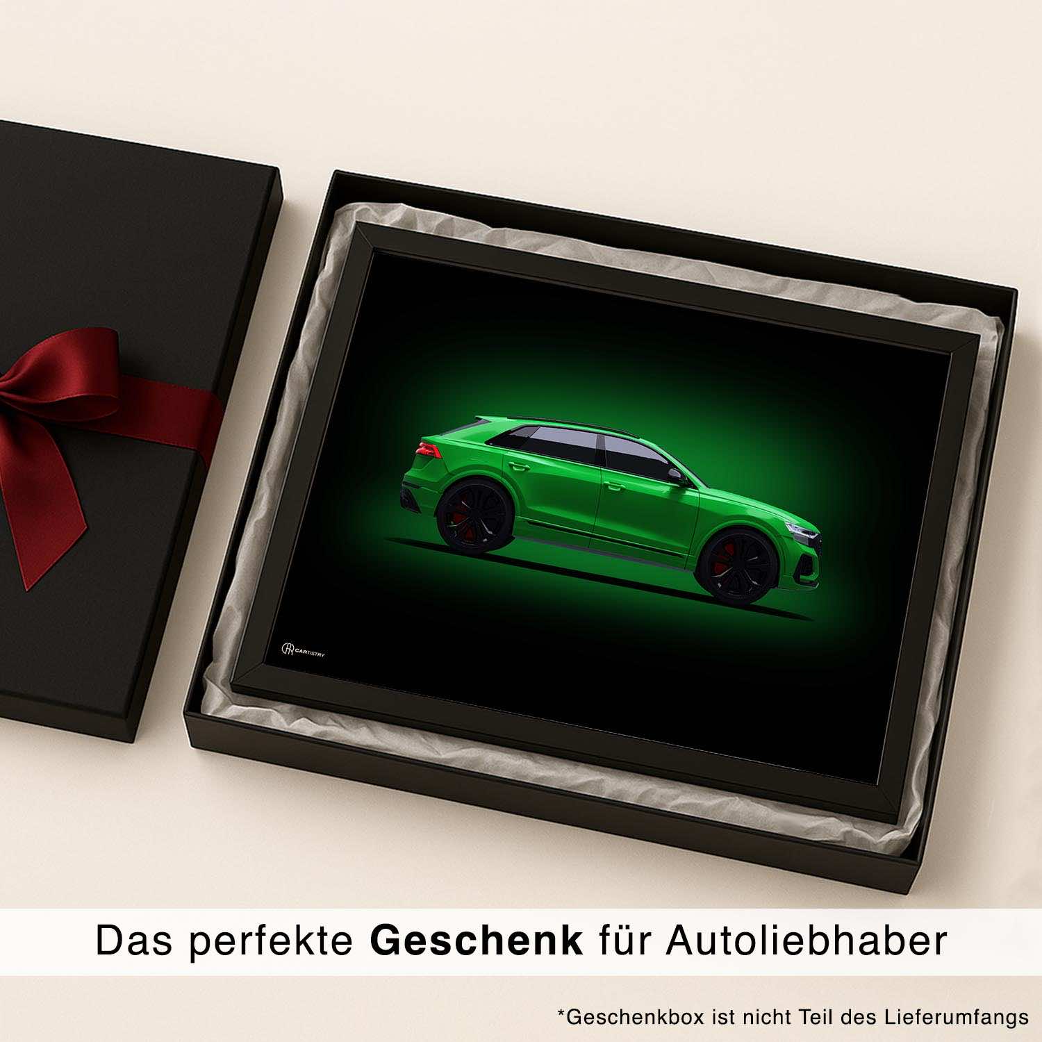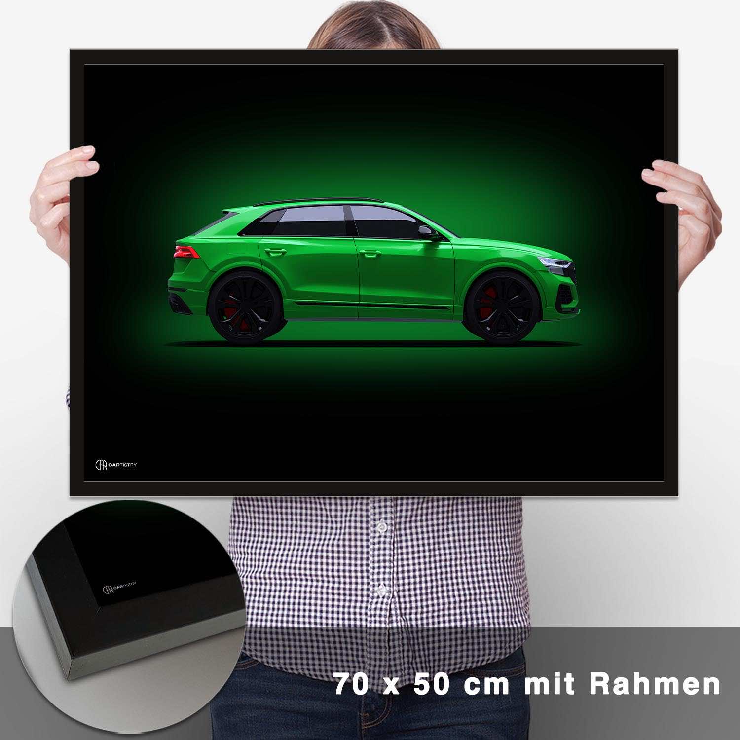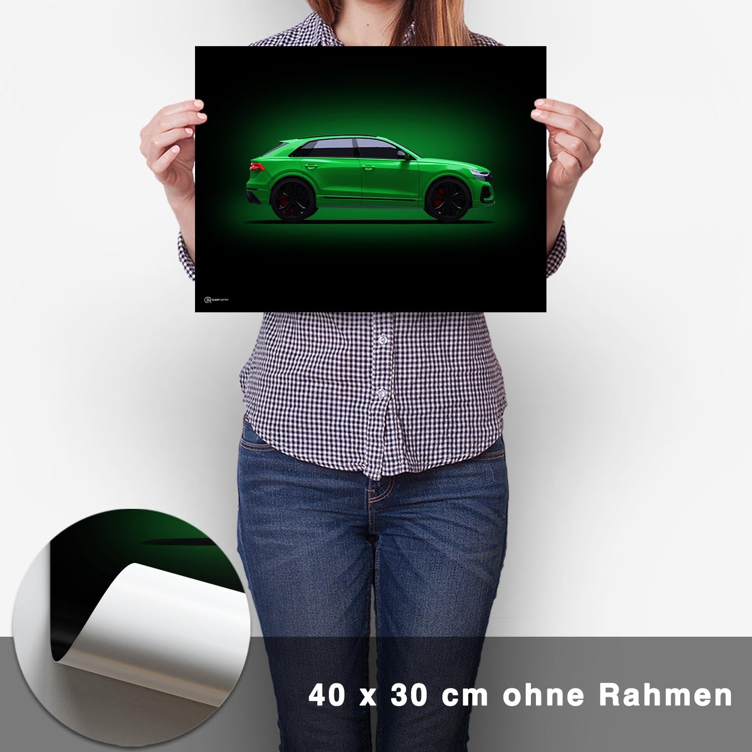 CARTISTRY Premium Poster in verschiedenen Größen (70x50cm und 40x30cm). Hergestellt in Deutschland auf hochwertigem 250g Premium-Papier. Dieses Poster zeigt einen Audi RS Q8 in der Seitenansicht in dunkler ...