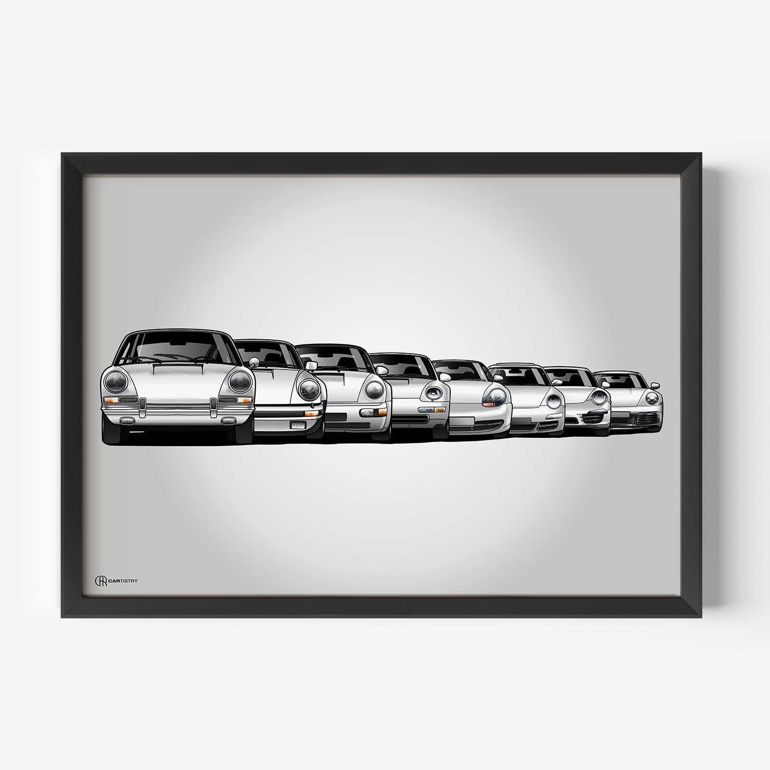 CARTISTRY Premium Poster in verschiedenen Größen (70x50cm und 40x30cm). Hergestellt in Deutschland auf hochwertigem 250g Premium-Papier. Dieses Poster zeigt alle aktuellen Modelle der Porsche 911 Generationen (930, ...