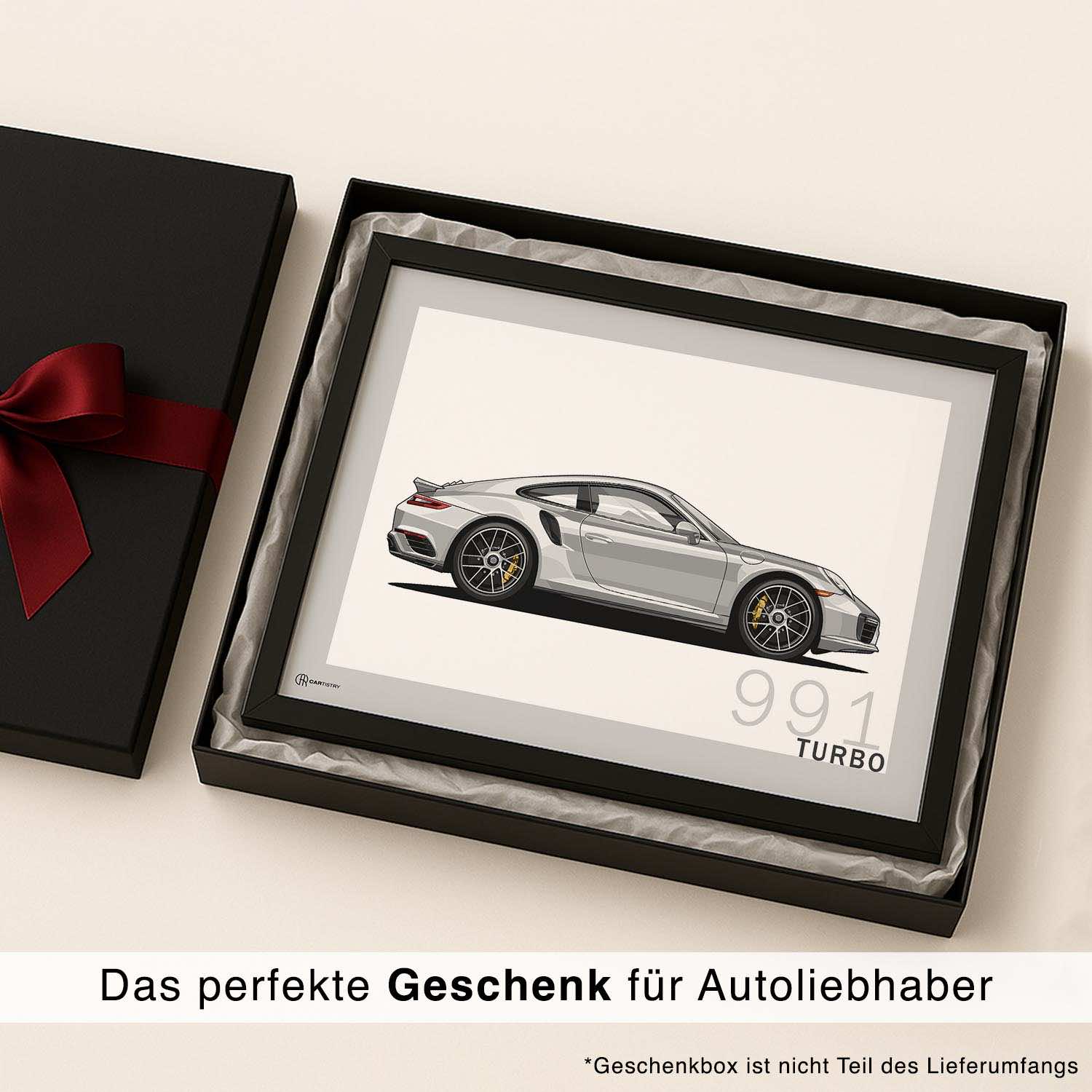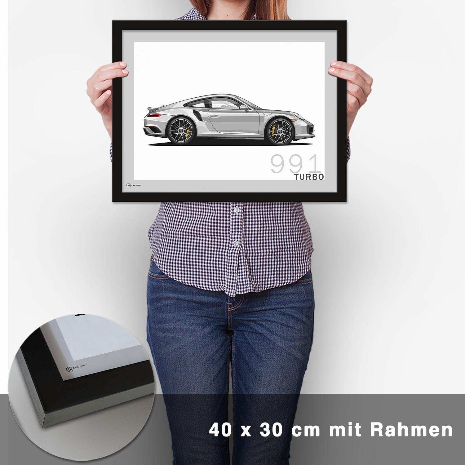 CARTISTRY Premium Poster in verschiedenen Größen (70x50cm und 40x30cm). Hergestellt in Deutschland auf hochwertigem 250g Premium-Papier. Dieses Poster zeigt ein Artwork eines Porsche 911 Turbo (991) in der Seitenansicht. Gemacht ...