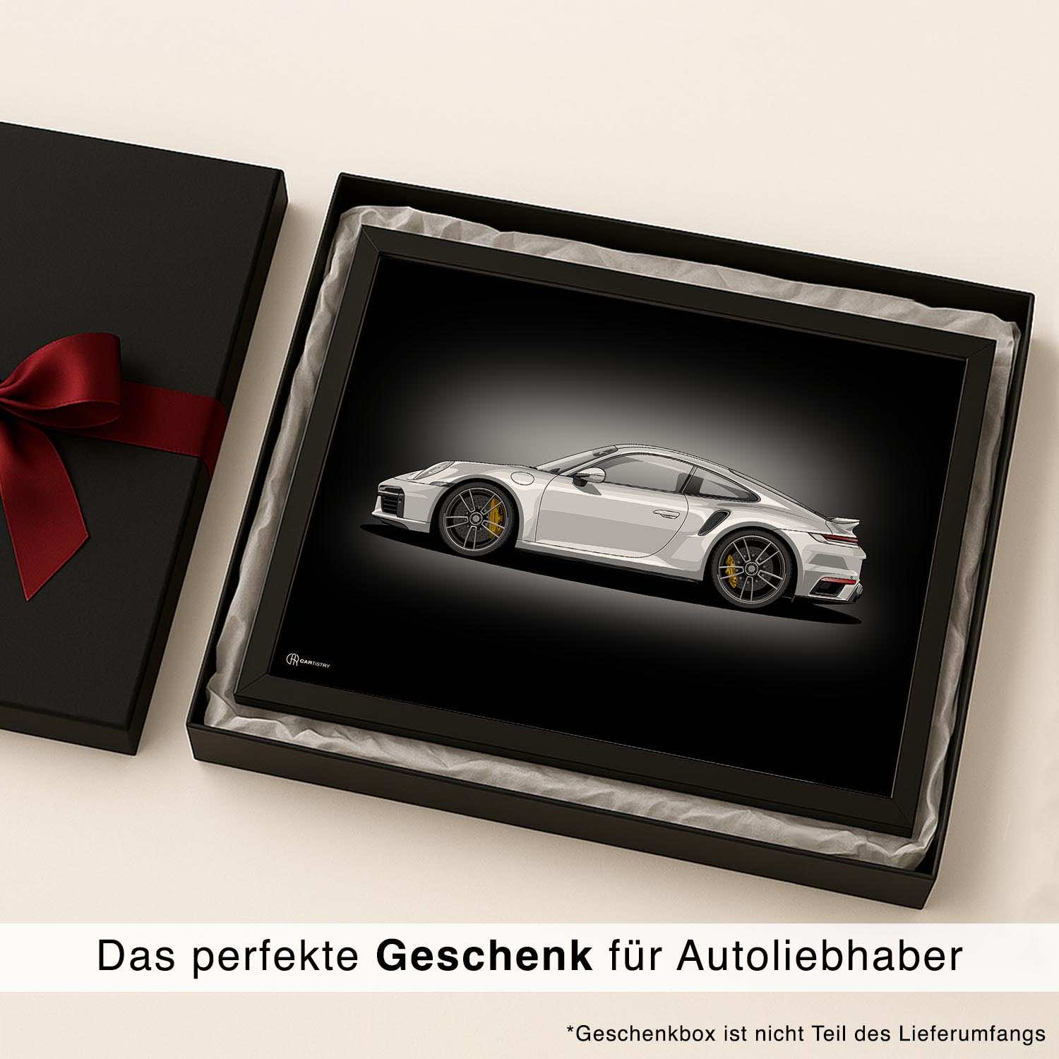 CARTISTRY Premium Poster in verschiedenen Größen (70x50cm und 40x30cm). Hergestellt in Deutschland auf hochwertigem 250g Premium-Papier. Dieses Poster zeigt ein Artwork eines Porsche 911 Turbo (992) in der Seitenansicht in dunkler Ausführung. ...