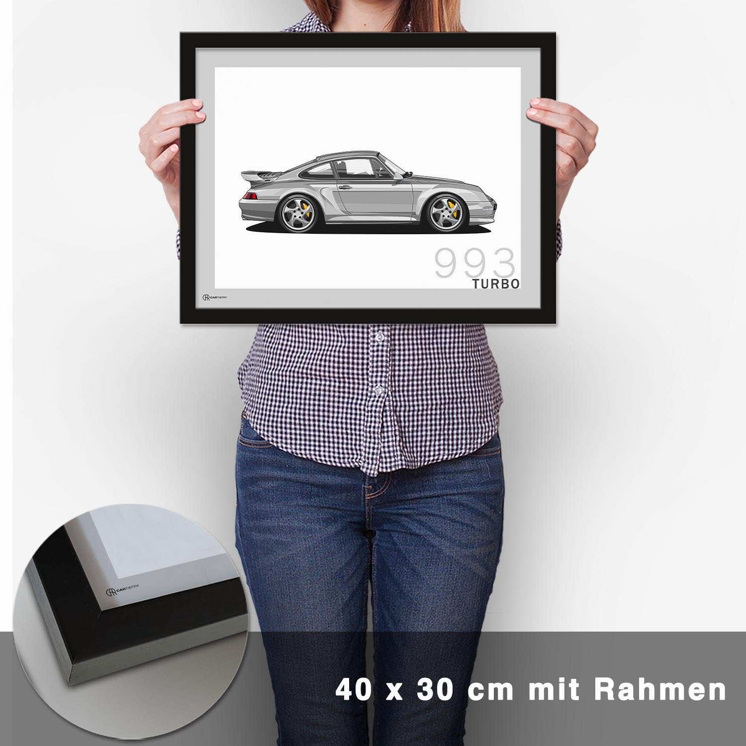 CARTISTRY Premium Poster in verschiedenen Größen (70x50cm und 40x30cm). Hergestellt in Deutschland auf hochwertigem 250g Premium-Papier. Dieses Poster zeigt ein Artwork eines Porsche 911 Turbo (993) in der Seitenansicht. Gemacht ...