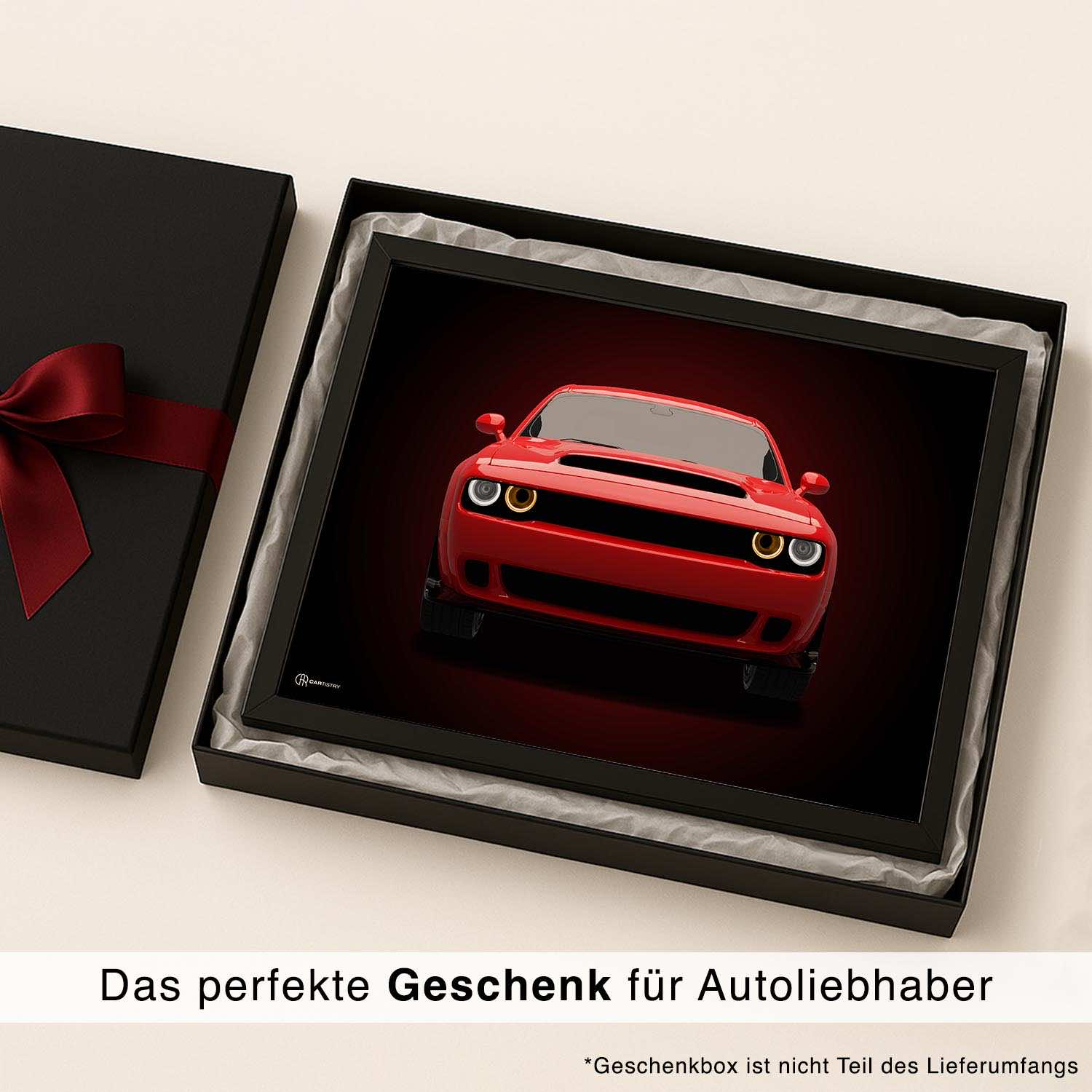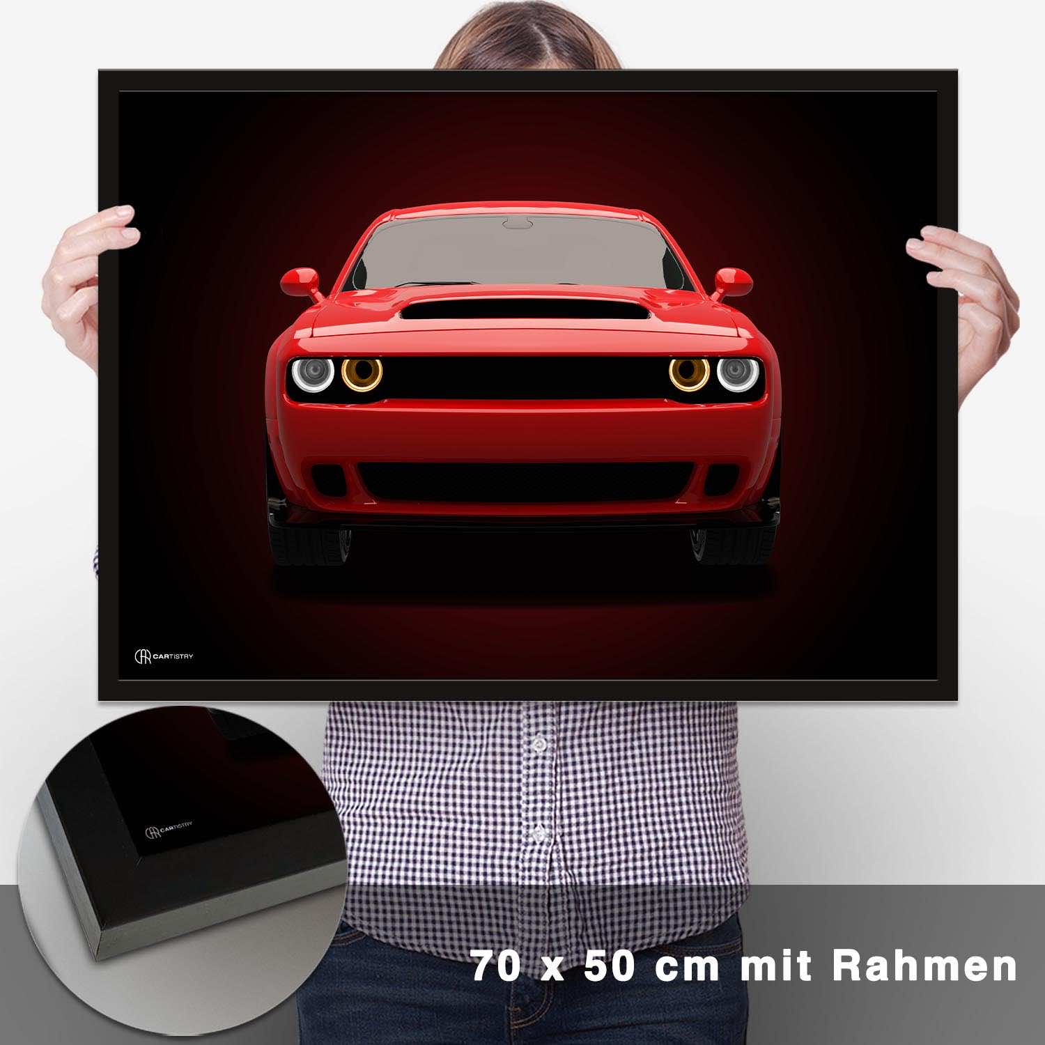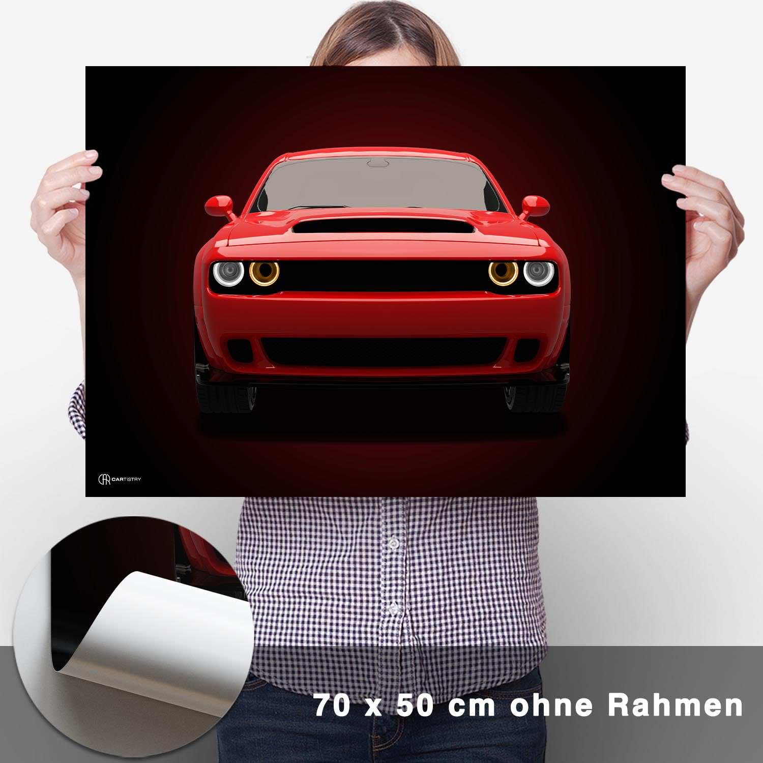CARTISTRY Premium Poster in verschiedenen Größen (70x50cm und 40x30cm). Hergestellt in Deutschland auf hochwertigem 250g Premium-Papier. Dieses Poster zeigt einen Dodge Challenger SRT Demon in der Frontansicht. Gemacht ...