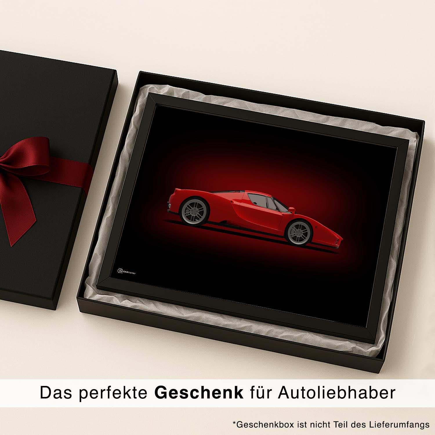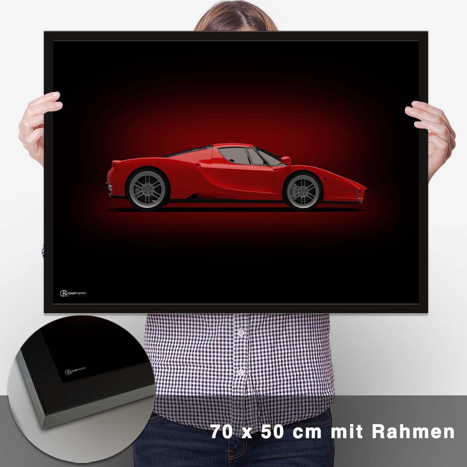 CARTISTRY Premium Poster in verschiedenen Größen (70x50cm und 40x30cm). Hergestellt in Deutschland auf hochwertigem 250g Premium-Papier. Dieses Poster zeigt einen Ferrari Enzo in der Seitenansicht in dunkler Ausführung. Gemacht ...