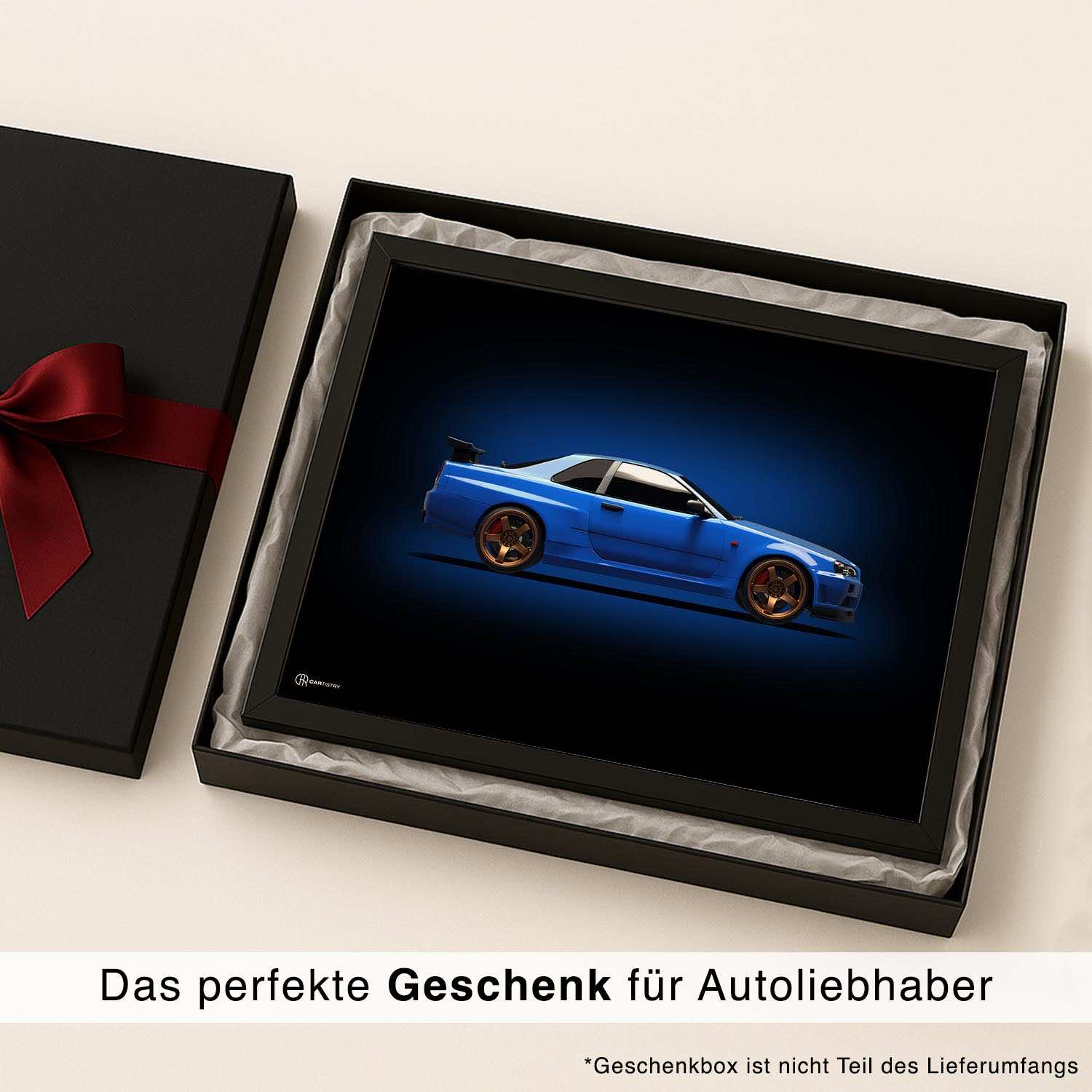 CARTISTRY Premium Poster in verschiedenen Größen (70x50cm und 40x30cm). Hergestellt in Deutschland auf hochwertigem 250g Premium-Papier. Dieses Poster zeigt einen Nissan GTR R34 Skyline in ...