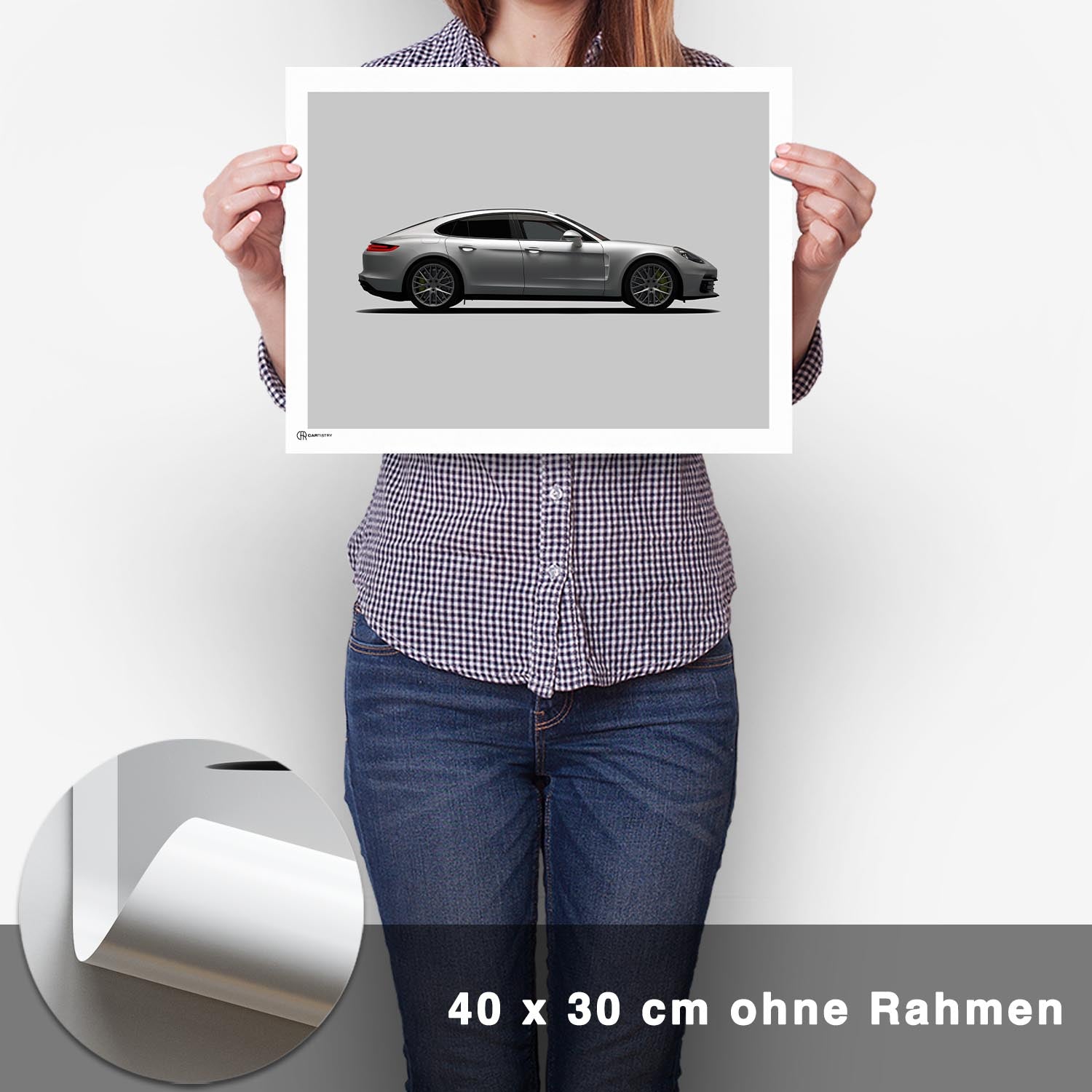 CARTISTRY Premium Poster in verschiedenen Größen (70x50cm und 40x30cm). Hergestellt in Deutschland auf hochwertigem 250g Premium-Papier. Dieses Poster zeigt einen Porsche Panamera in der Seitenansicht in heller ...