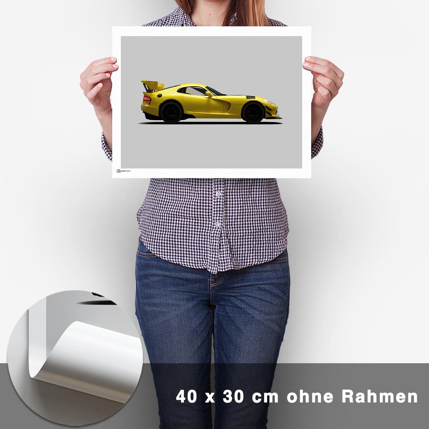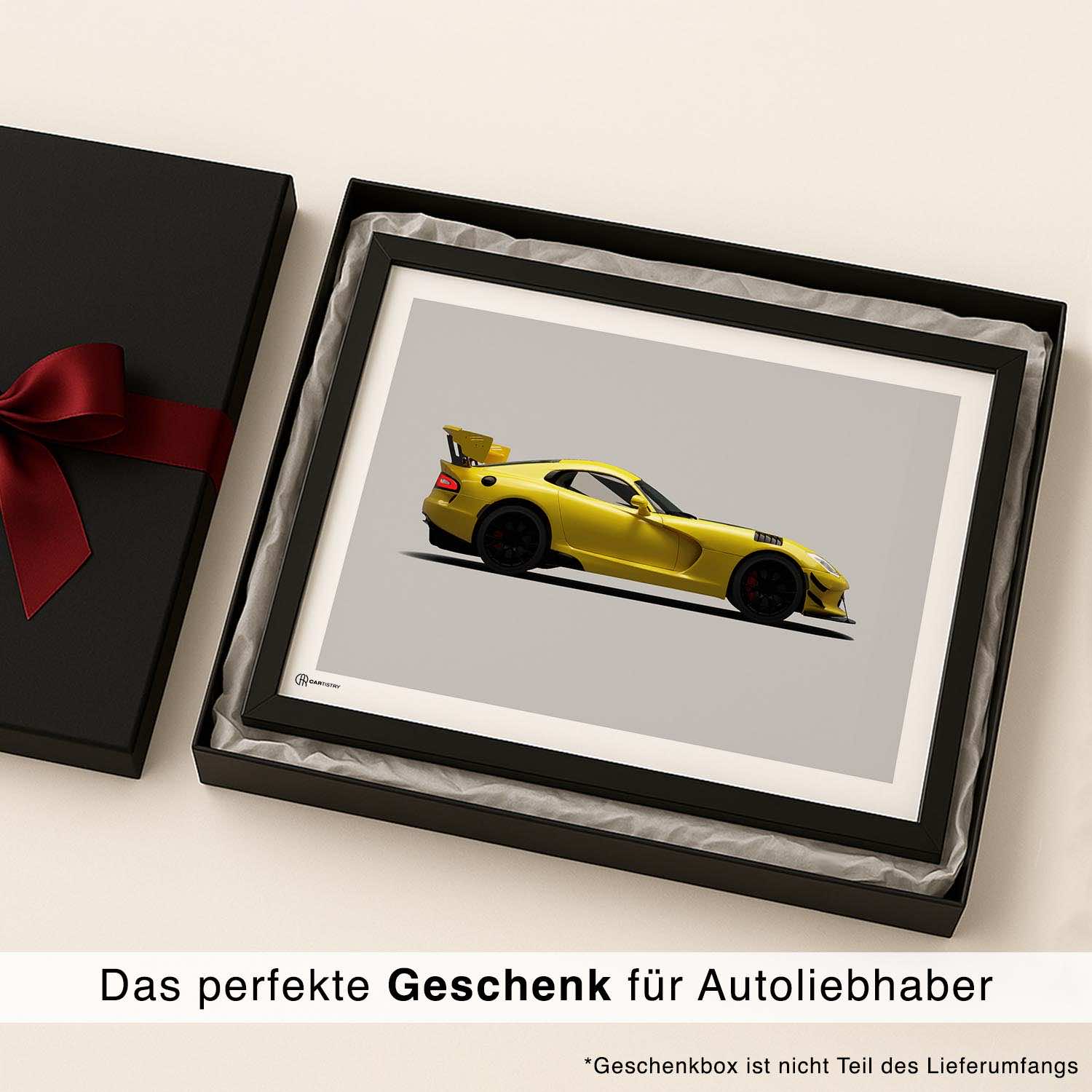 CARTISTRY Premium Poster in verschiedenen Größen (70x50cm und 40x30cm). Hergestellt in Deutschland auf hochwertigem 250g Premium-Papier. Dieses Poster zeigt eine Dodge Viper in der Seitenansicht in heller Ausführung. Gemacht ...