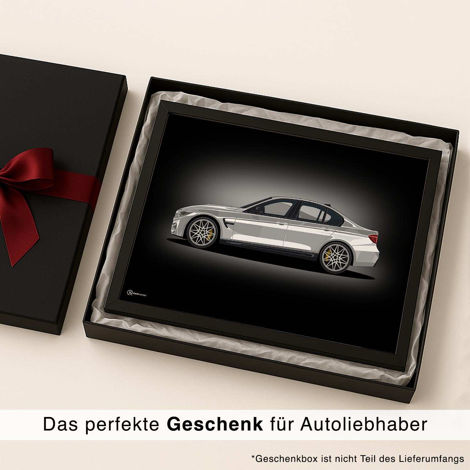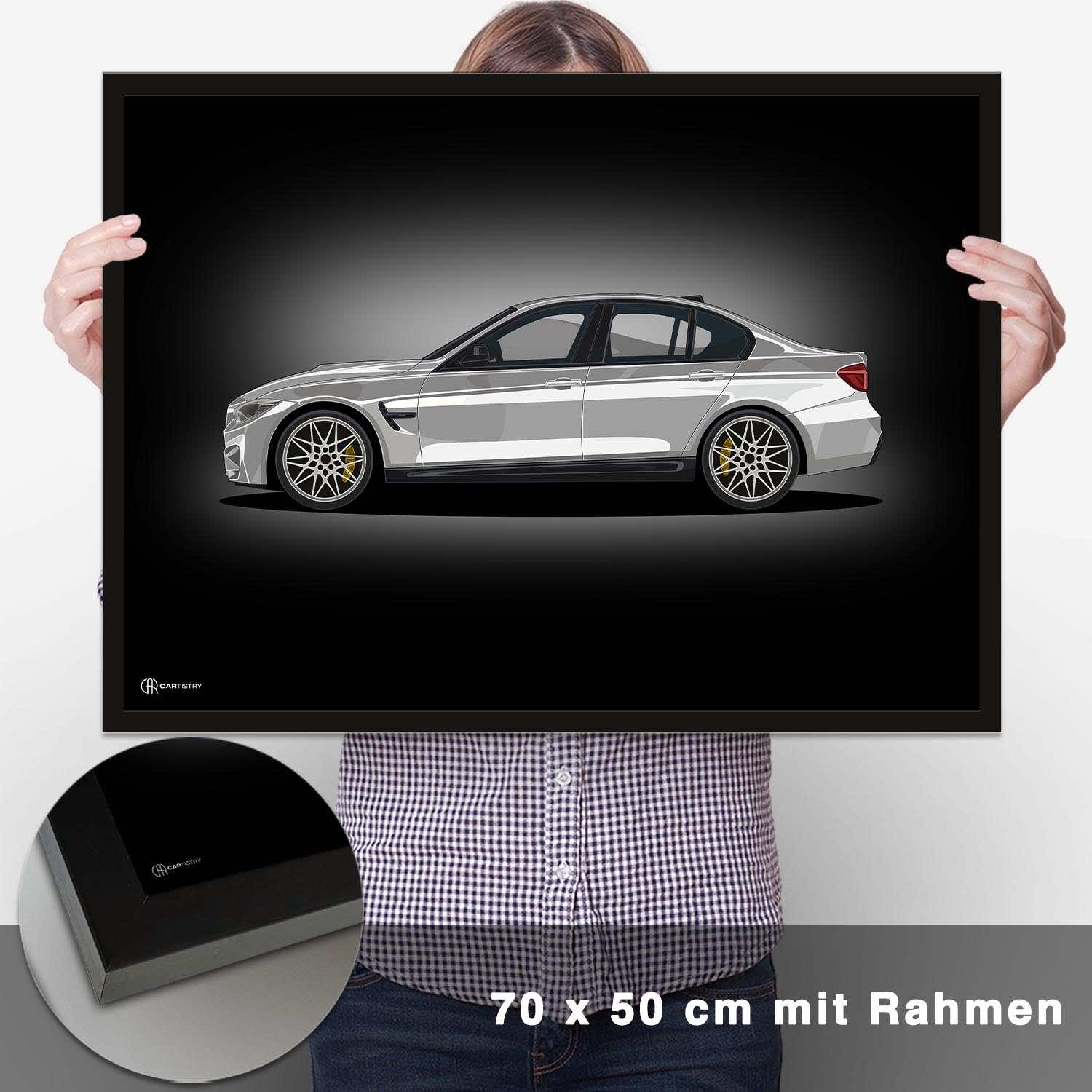 CARTISTRY Premium Poster in verschiedenen Größen (70x50cm und 40x30cm). Hergestellt in Deutschland auf hochwertigem 250g Premium-Papier. Dieses Poster zeigt ein Artwork von einem BMW M3 F80 in der Seitenansicht ...