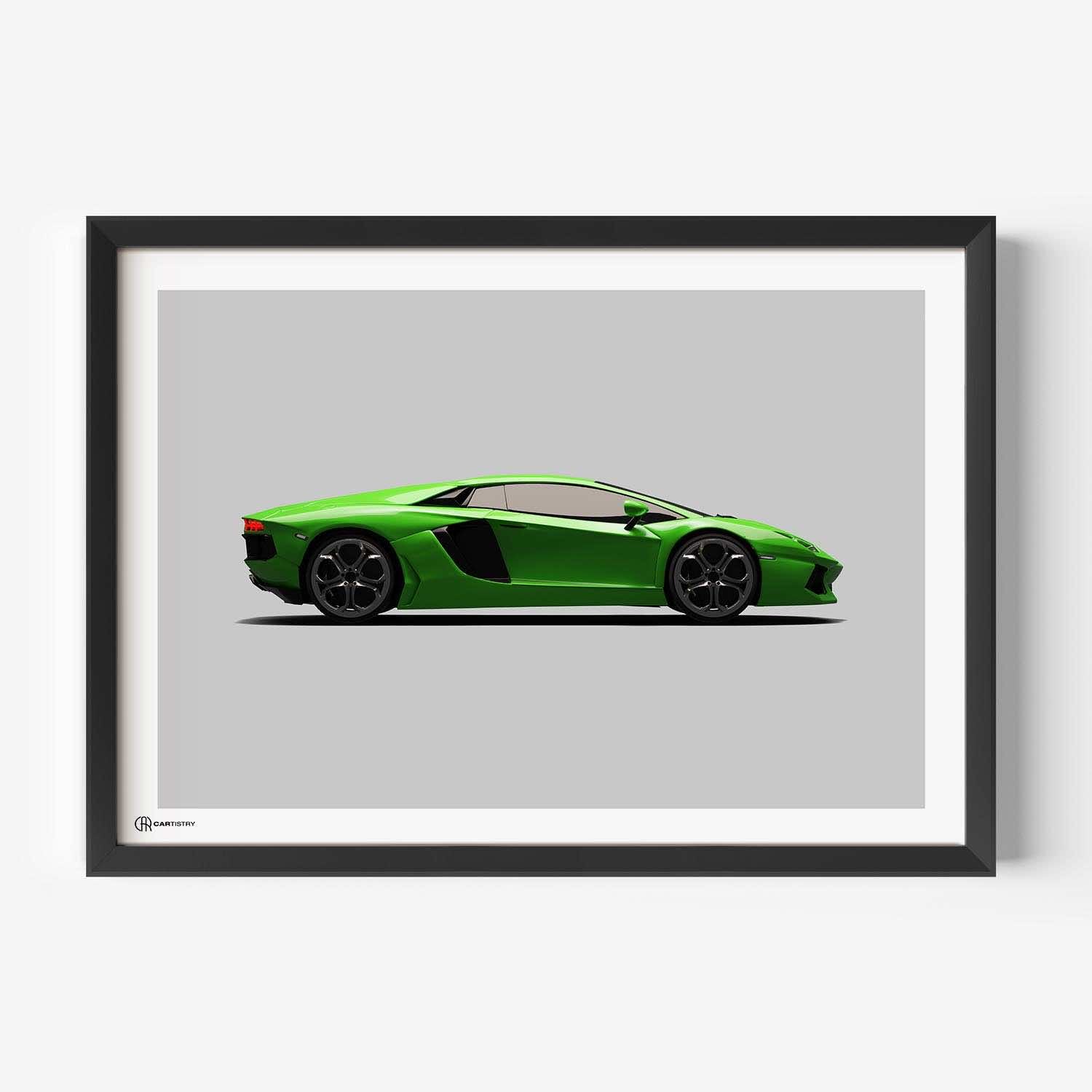 CARTISTRY Premium Poster in verschiedenen Größen (70x50cm und 40x30cm). Hergestellt in Deutschland auf hochwertigem 250g Premium-Papier. Dieses Poster zeigt einen Lamborghini Aventador in der Seitenansicht in heller Ausführung. Gemacht ...