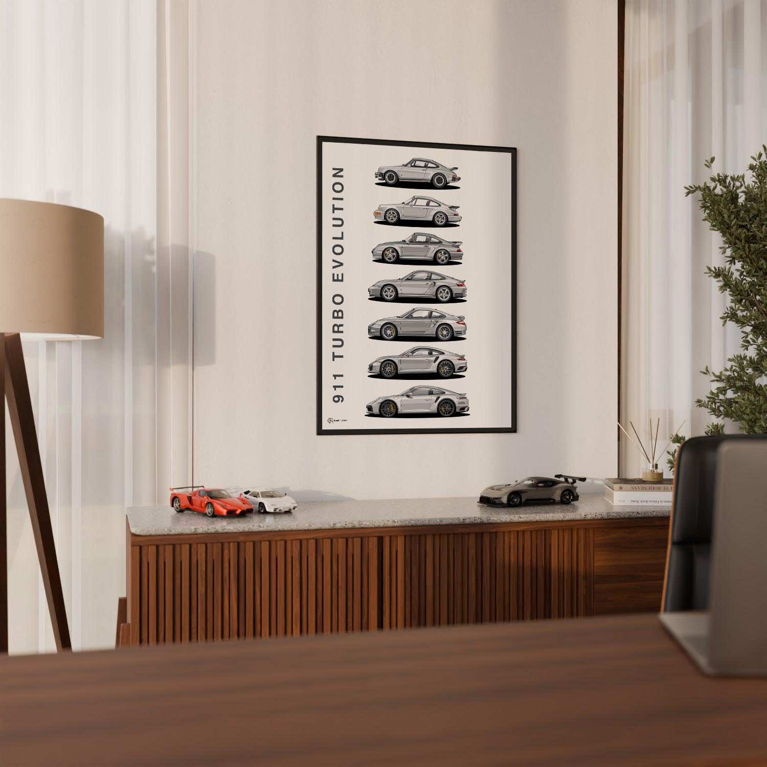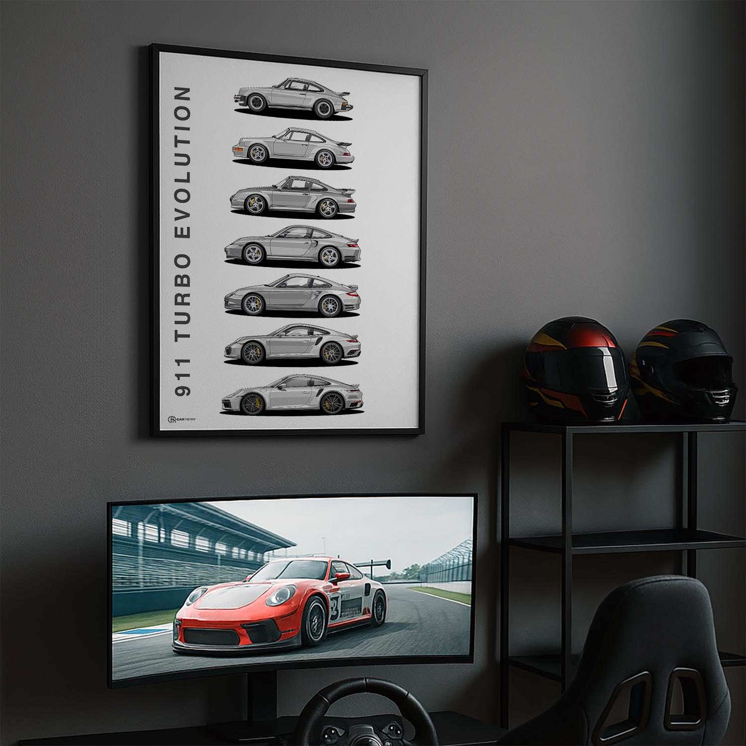 CARTISTRY Premium Poster in verschiedenen Größen (70x50cm und 40x30cm). Hergestellt in Deutschland auf hochwertigem 250g Premium-Papier. Dieses Poster zeigt Artworks aller aktuellen Porsche 911 Turbo Generationen (930, 964, 993, 996, ...
