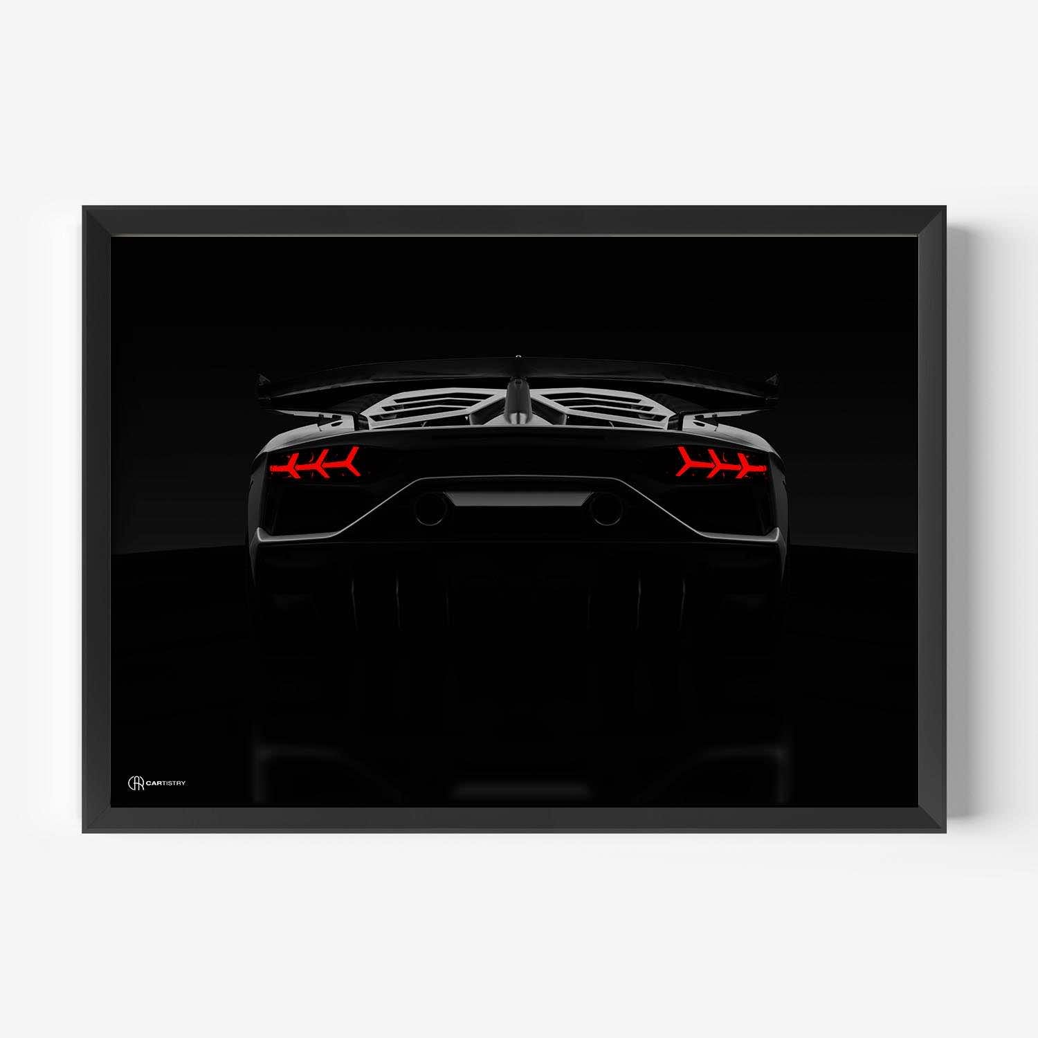 CARTISTRY Premium Poster in verschiedenen Größen (70x50cm und 40x30cm). Hergestellt in Deutschland auf hochwertigem 250g Premium-Papier. Dieses Poster zeigt einen Lamborghini Aventador in der Heckansicht ...