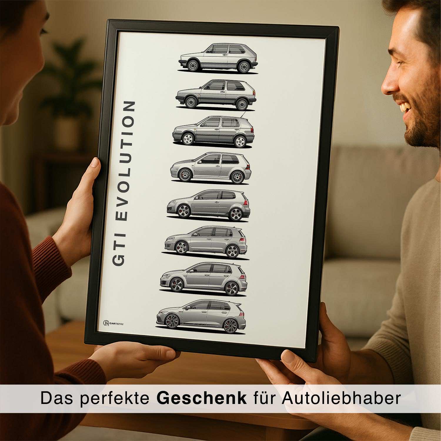 CARTISTRY Premium Poster in verschiedenen Größen (70x50cm und 40x30cm). Hergestellt in Deutschland auf hochwertigem 250g Premium-Papier. Dieses Poster zeigt Artworks der Volkswagen Golf GTI Generationen (Golf ...